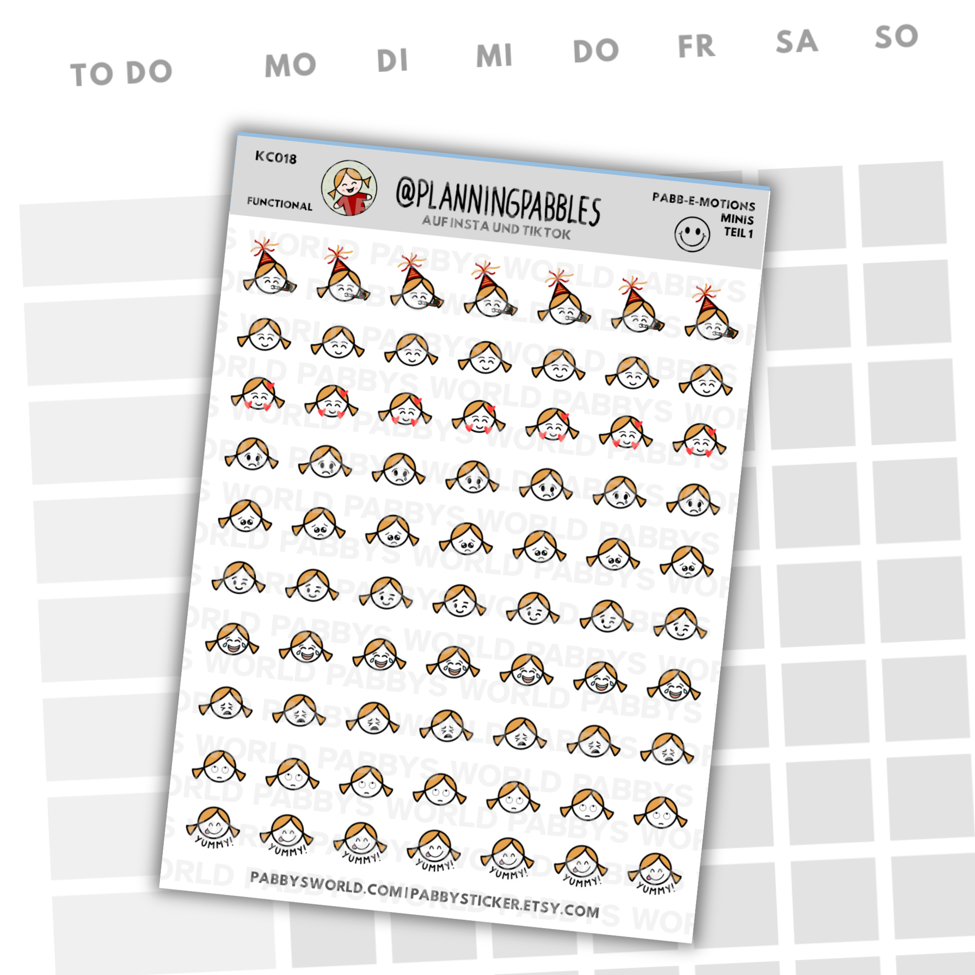 Bisher gibt es ein Mini-Stickersheet (die einzelnen Sticker sind 1,3 cm breit) mit zehn verschiedenen PABB-E-MOTIONS. Weitere sind geplant, auch größere.