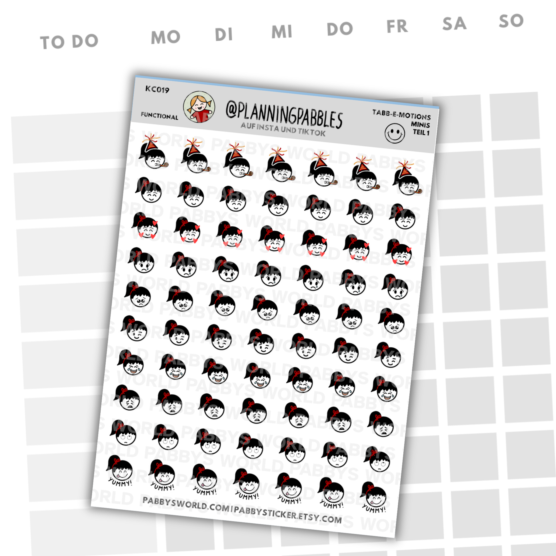 Bisher gibt es ein Mini-Stickersheet (die einzelnen Sticker sind 1,3 cm breit) mit zehn verschiedenen TABB-E-MOTIONS. Weitere sind geplant, auch größere.