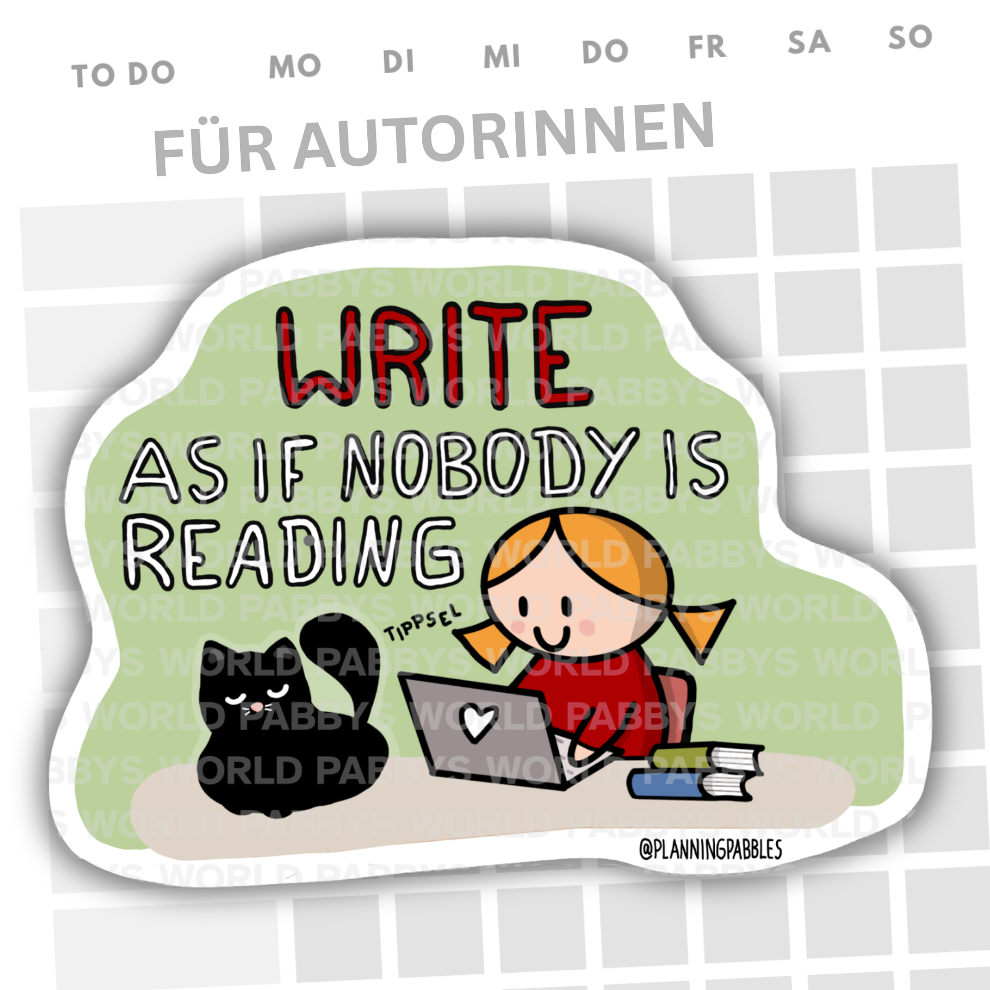 Dieser handgezeichnete Sticker für Autorinnen zeigt meine Signature-Figur PABBY (ein blondes Mädchen mit Zöpfen) schreibend am Laptop. Neben ihr thront eine schwarze Katze. Schriftzug auf dem Sticker: WRITE AS IF NOBODY IS READING.